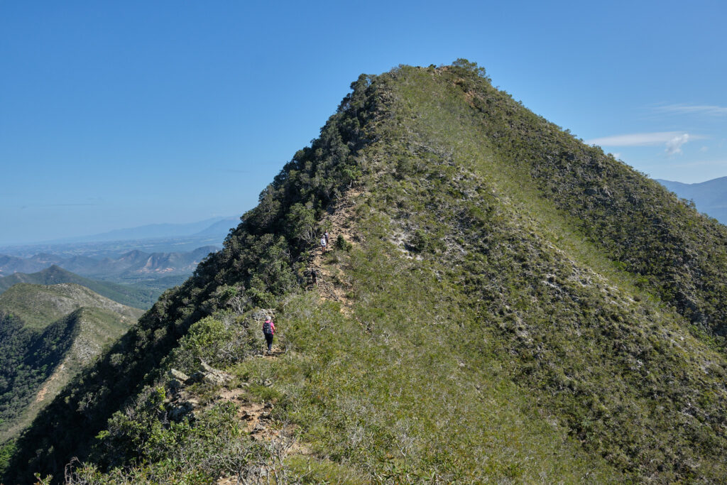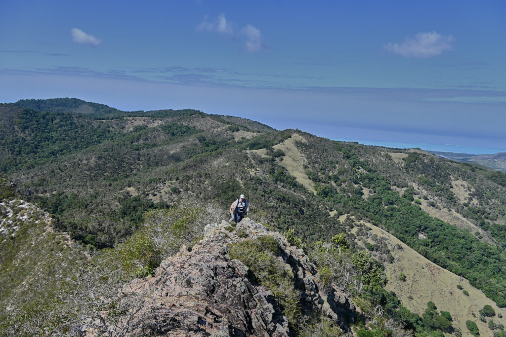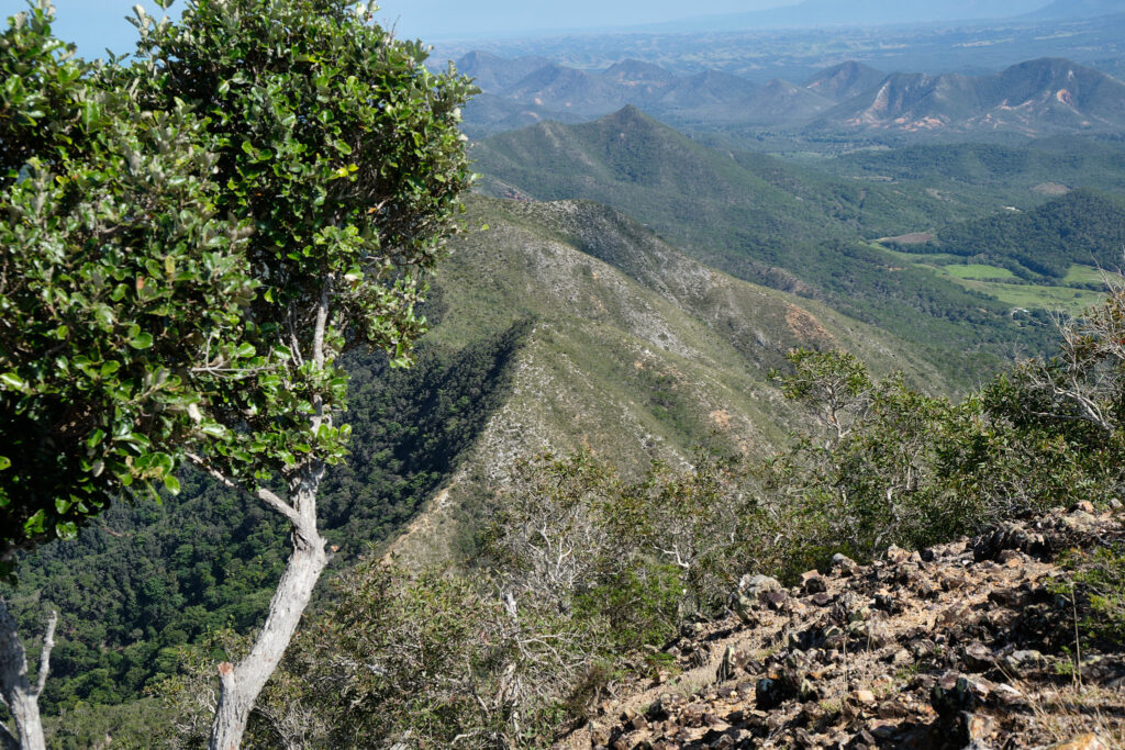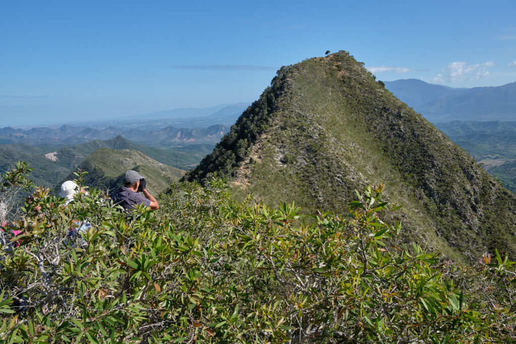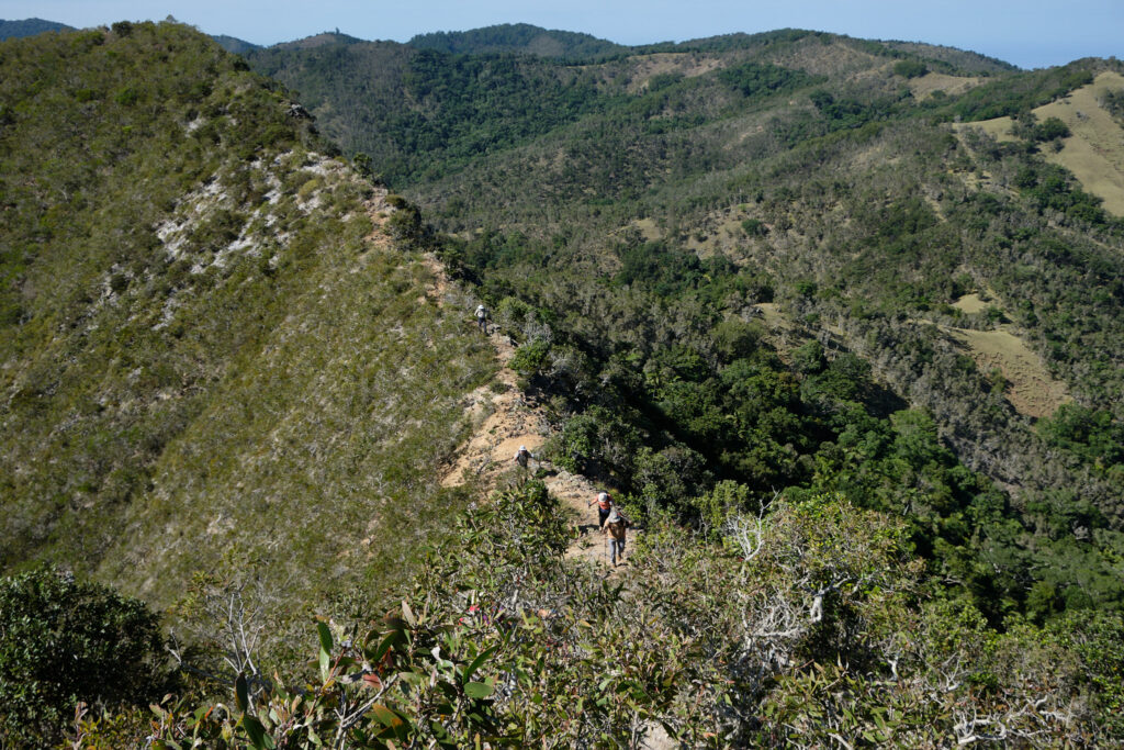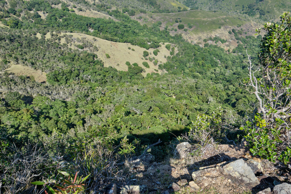 Après une montée soutenue en sous-bois avec l’appui d’arbustes pour nous hisser, nous débouchons sur le pic du milieu avant de poursuivre en direction du pic le plus haut des 3 frères. Le sentier est rocheux avec des versants impressionnants de part et d’autre. Chaque pas doit être assuré.