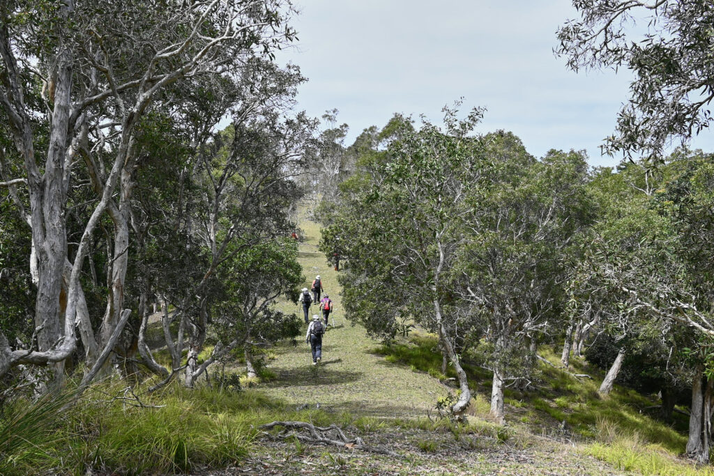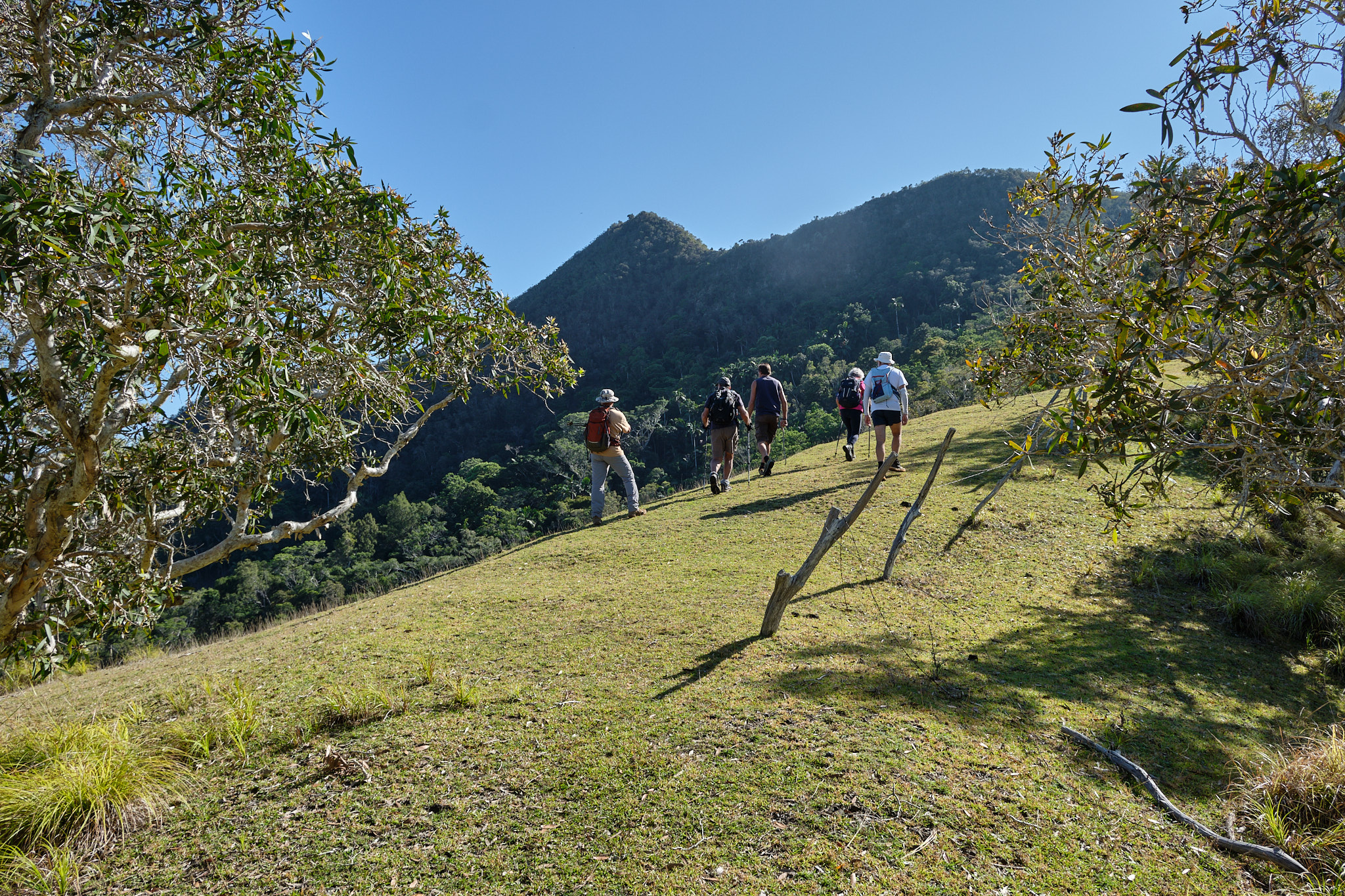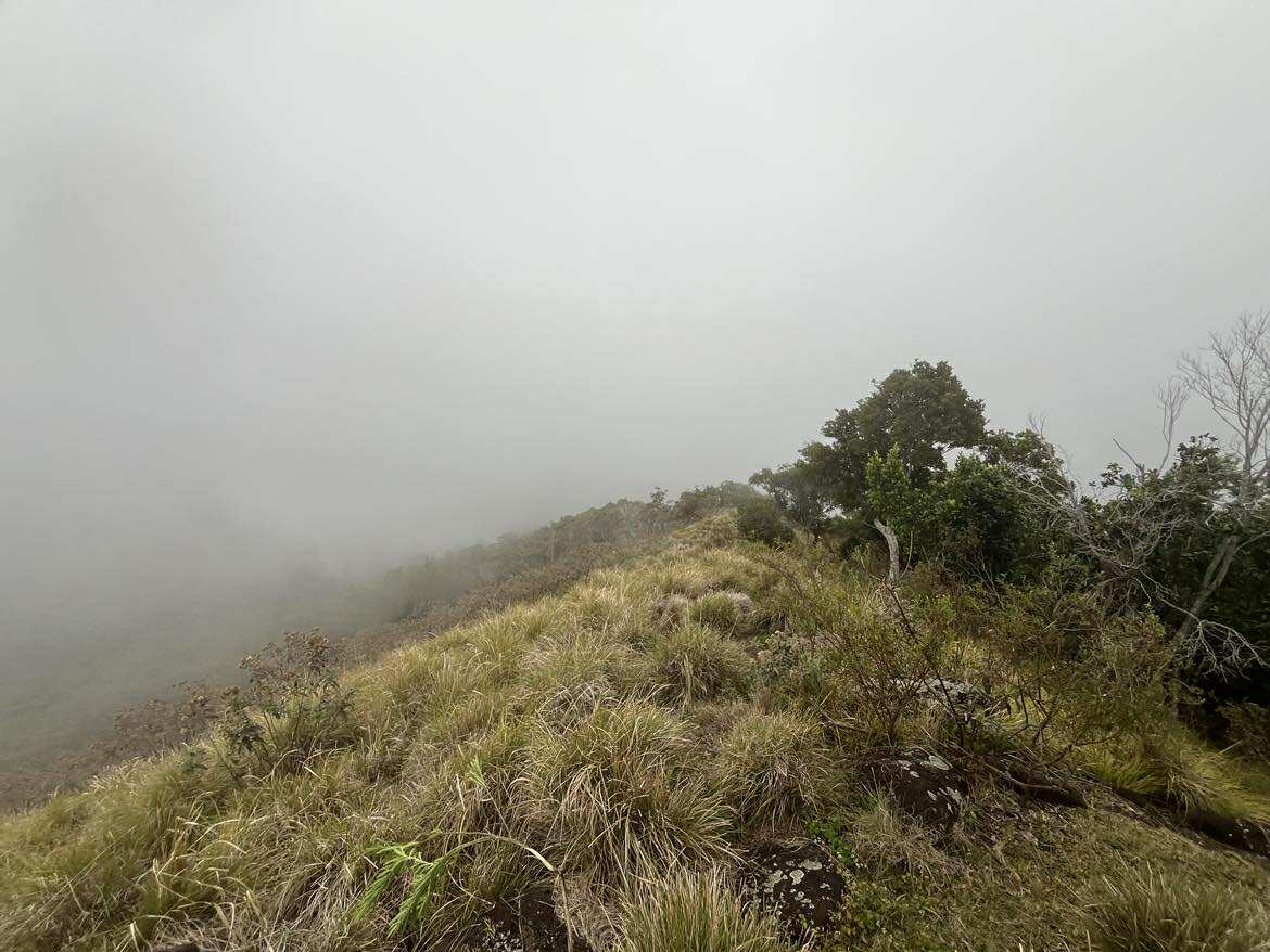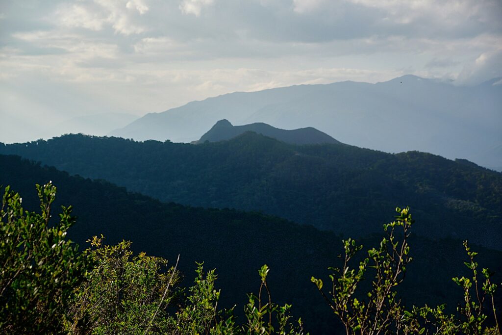 Après une montée soutenue en sous-bois avec l’appui d’arbustes pour nous hisser, nous débouchons sur le pic du milieu avant de poursuivre en direction du pic le plus haut des 3 frères. Le sentier est rocheux avec des versants impressionnants de part et d’autre. Chaque pas doit être assuré.