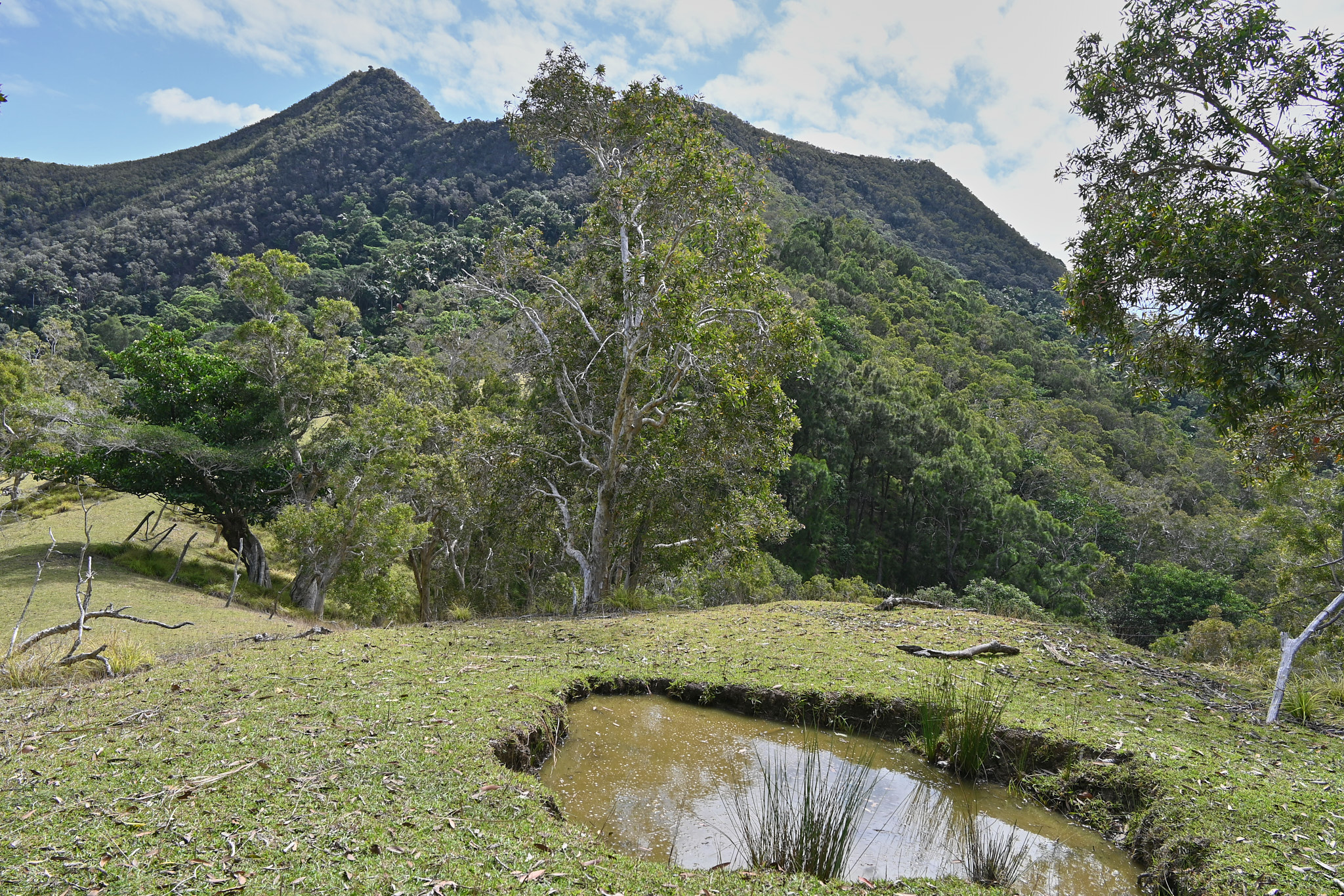 Nous redescendons jusqu’en bas de la rivière Courie (Wâ Kwiri) pour emprunter une piste de propriété fermée par un portail cadenassé. Là encore, un 4×4 est indispensable et le propriétaire nous précède pour nous conduire à destination.